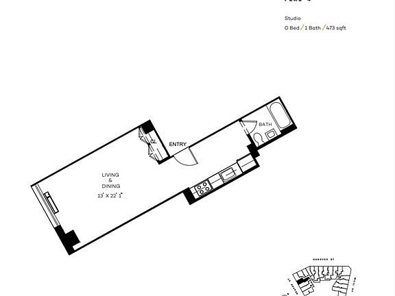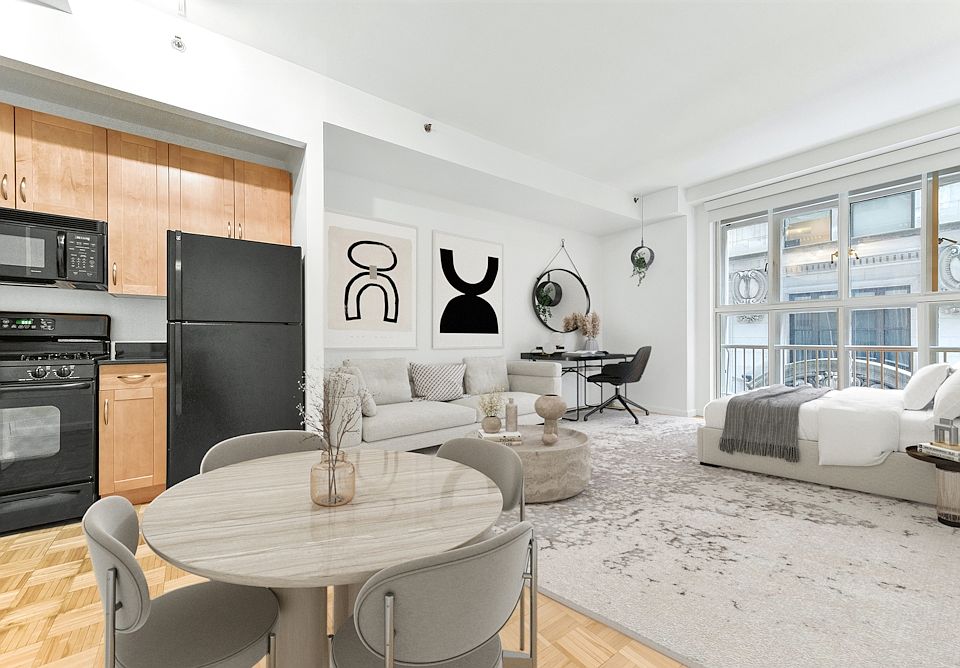 This studio is beautifully outfitted with light parquet floors, a large floor to ceiling window, and a bathroom featuring Italian Marble and a custom vanity. Images represent the finishes of the apartment.