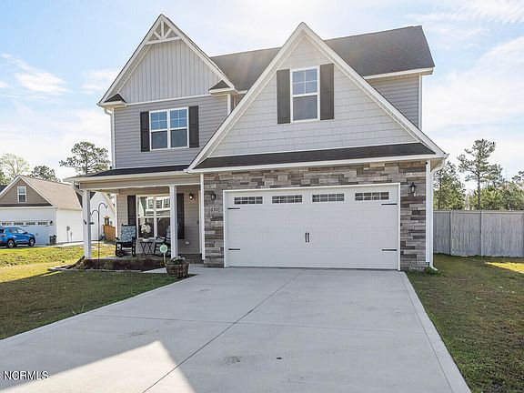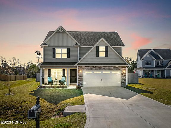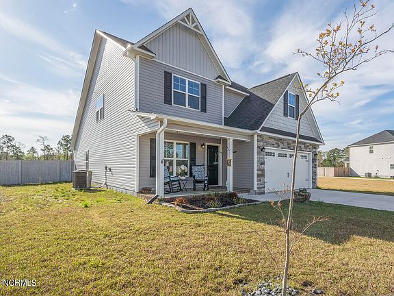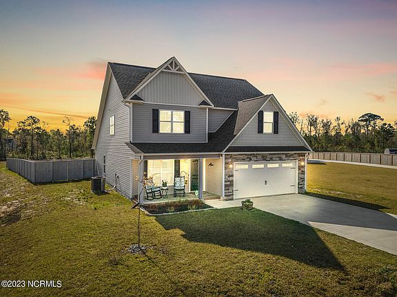 Like new! Comes with a one year 2-10 Home Warranty and the sellers will pay up to $7,000 towards costs associated with interest rate buy down! 4bd plus BONUS/STUDY! Just under 1.5acres! Not only is this home close to the 172 Gate to Camp Lejeune, it is also not too far from Cherry Point! There is a walking trail around the nearby lake where you can take the dog or just watch the ducks in passing! That being said you may not want to leave the house with the generous back yard size already FENCED in for you! Like new play set in the backyard conveys as well! Upon entering the home you have a beautiful dining room with with coffered ceiling. Down the hall will be the laundry room and then the spacious kitchen which has and upgraded lighting fixture, subway tile, GRANITE COUNTER TOPS and the refrigerator conveys! From the sink you can look into the living room with a large open vaulted ceiling! There are ceiling fans already installed throughout the home! The owners suite is on the first floor as well and includes a spacious bathroom and large walk in closet. Upstairs there is a large ''study'' with a closet great for use as an office space or as a play room or man cave/crafting room - so many possibilities! A full bathroom and three other large bedrooms finish off the upstairs!