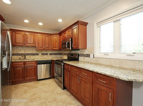 "Turn-key ready" is an understatement! EAST of the Fox River location means EZ access to commuter routes for work or play...and plenty of shopping/dining options nearby! Gorgeous curb appeal is a fitting introduction to the chic & stylish interior. Main level features glossy hardwood floor in the Living room w/large bayed window to bring the light in! Stunning Kitchen offers 42" Cherry cabinetry with soft close feature, tumbled marble & glass mosaic backsplash + sleek Granite counters...just WOW. Dining area offers sliding glass doors to the upper level deck & gorgeous backyard. Spacious bedrooms are highlighted by new flooring & closets w/organizers for maximum storage space! Main bath also completely renovated w/dual vanity, updated lighting & classy ceramic tiled shower featuring recessed shelves!! Lower level walk-out features Family room with brick fireplace to keep cozy on chilly nights, sliders to cement patio, full bath & laundry. Heated garage! Fenced yard. Don't miss this!!