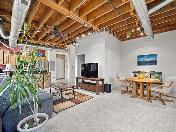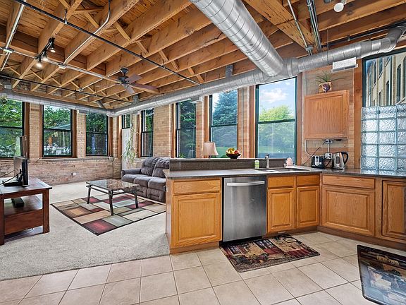 Don't miss out on this gem! Endunit 2 bed 1 bath condo in historic Shoe Factory Lofts. Open floor plan is bathed in natural light with 12' ceilings and oversized windows. Exposed brick and beams throughout unit. Kitchen features granite countertops, ss appliances, and eat-in breakfast bar. Newer carpet in living area. First floor laundry with newer washer/dryer. Bedrooms boast hardwood floors and huge walk-in closets. Tons of storage space. Private patio. 1-car garage plus 2 assigned spaces (#23/24 close to entry) included. Secure building entrance. Easy access to I-90 & Metra