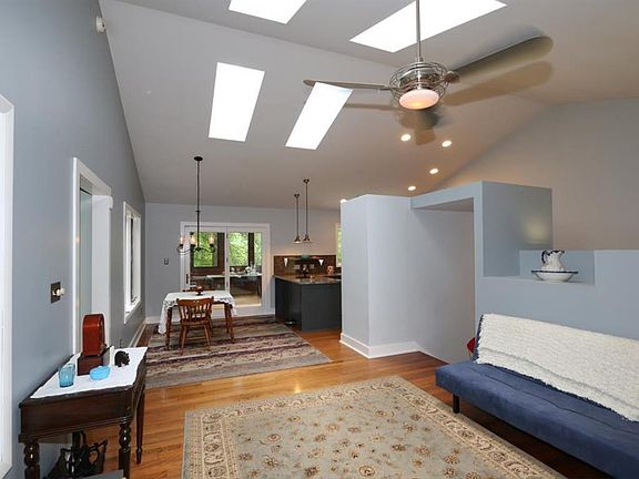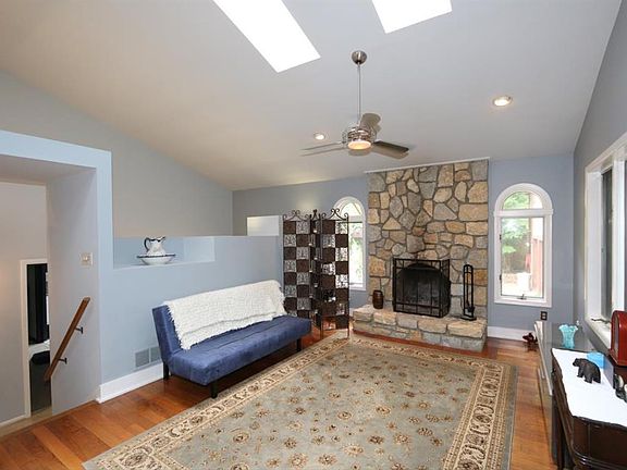 Unique multi-level home surrounded by nature. Large rear deck overlooking the woods. 2 car garage w/suite above offering kitchenette, bedroom, bath & LR. Main house offers cathedral ceilings, three seasons room, hwd floors & beautiful fpl