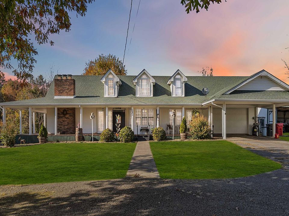 The property includes a 2-car attached garage, 2-car covered carport, two outbuildings, and a metal barn shed, all situated on a 1-acre lot. Enjoy the outdoors and relax after a long day on the 968 sq ft covered wrap-around porch.