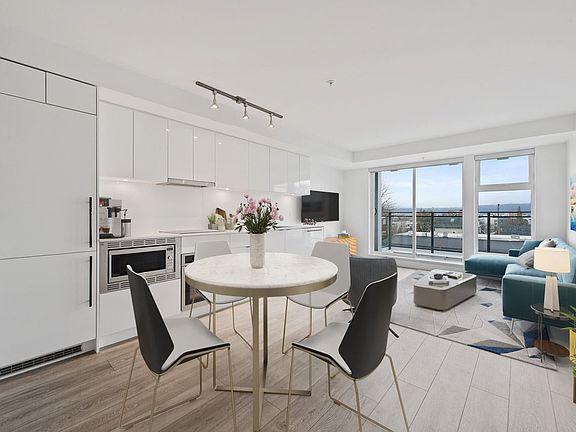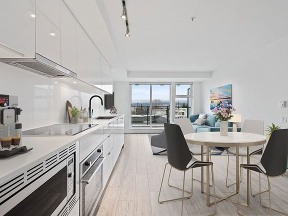 Welcome to Midtown Modern by PortLiving. This junior 1 bed w/ MOUNTAIN VIEWS is in the most rapidly growing neighbourhood in Vancouver. This 558 sq ft end unit boasts many contemporary features including gourmet linear kitchen w/ s/s appliances, panelled dishwasher, pure white quartz c/t's + built in microwave. Upgraded bedroom includes glass partitions for ultimate privacy and walk-in closet. The spacious spa-like bathroom includes radiant heated ceramic floors, glass shower, + hidden storage in the mirror. Includes 1 parking, 1 storage locker, and 1 bike locker. Superb location close to transit, restaurants, shopping, cafes and a short walk to the future Skytrain station. VIEWS from your north facing balcony. Pets/rentals allowed. BONUS: Under warranty for 8 years! By appointment only.
