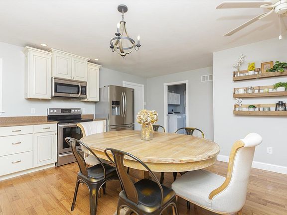 Welcome to a beautiful ranch home, just 2 blocks from Historic Main Street! Enjoy vibrant local shops, eateries, Frontier Park & Katy Trail. Custom kitchen boasts stunning cabinetry, w/elegant glass doors, solid surface counters & stainless steel appliances. Flowing seamlessly into the family room are hickory hardwood floor adding warmth & character to this open-concept space. Family room features a vented gas fireplace adorned with granite surround for a perfect gathering spot. Retreat to the master bathroom suite, which includes custom frameless shower doors, chic ceramic tile, a spacious walk-in closet, & convenient linen closet. An equally impressive hall bath features marble vanity, unique custom curved trackless shower door, & relaxing tub. Lower level features an additional full bath and spacious rec room adding endless possibilities. Bonus Notables include a two-car oversized attached garage, low maintenance exterior. The 3rd bdr on the m/l could be used as an office/den.
