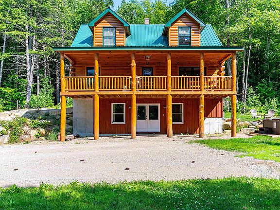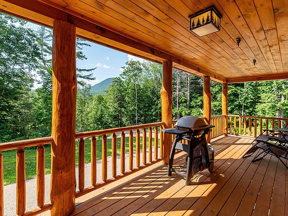 LOG HOME WITH PRIVACY & VIEWS! Located in a rural Jackson location, this beautiful home is less than ½ mile to the National Forest Service Trails & a 3-mile drive to Mountain Pond hiking loop or to Intervale’s 16A off Town Hall Rd. Set high on a hillside, this property offers amazing privacy as well as picturesque mountain views of Double Head, Tin Mt and a peak of Mt Washington. The main floor has an easy open design that wraps from its kitchen to living room and includes a large dining area facing the porch. Live edge kitchen counters, rustic cabinets and fully applianced with a back entrance door from the upper driveway to make it easy to bring in groceries & guests. 3 bedrooms and 2 full baths includes a primary ensuite with window seat to Mtn views and an elegant soaking tub. There is also a bedroom and full bath on the main level, to accommodate single floor accessibility needs, but could be converted into extra livingroom space. The lower level is a walk out with family room, bunk room, game space, laundry and lockable utility area. A 2nd parking area creates convenient access to yard & amenities. Soak in the 6-person hot tub, warm up by the fire pit or dine upstairs on the front porch, all while enjoying some of nature’s finest. Enhanced with many new features, this home has central air, FHA heat & exterior lighting for year-round efficiency with turn-key convenience and rental history, for those looking for extra income opportunities.