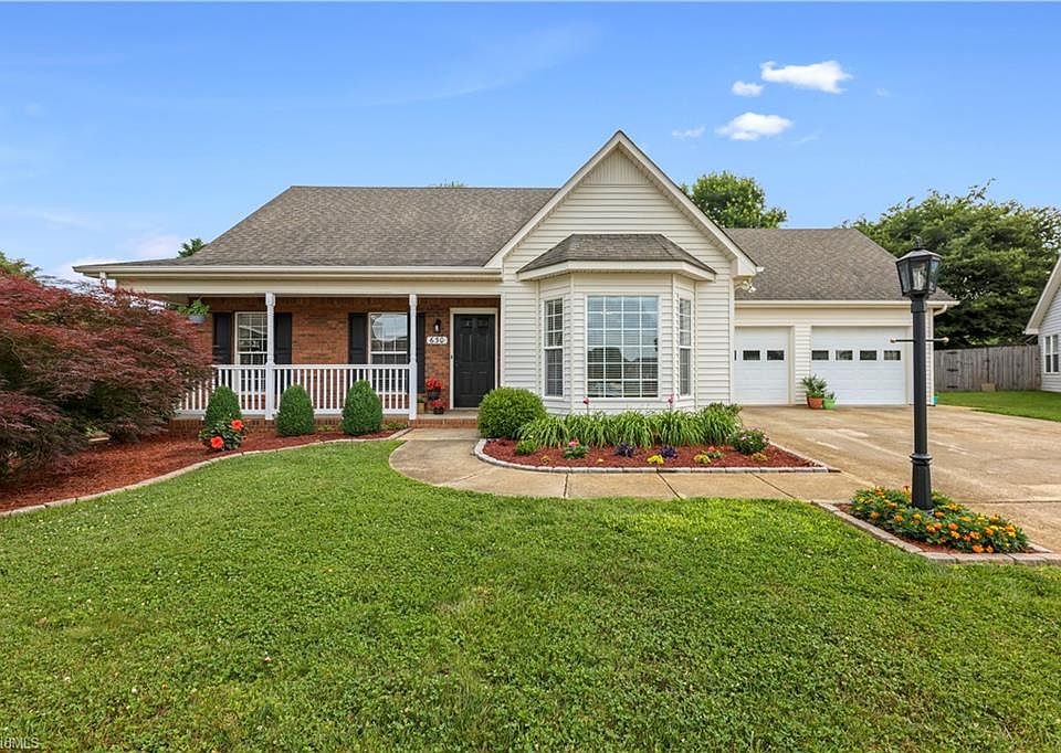 The offer deadline is Sunday at 6 pm. This 3 bedrooms 2 bath, plus bonus room home has fresh paint, beautiful hardwood flooring, NEW carpet, and is MOVE-IN READY! A spacious great room with a gas log fireplace and pretty built-ins is adjacent to the eat-in kitchen with granite counters and a formal dining room with a light-filled bay window. The primary suite, on the main level, affords double, granite sinks, jetted tub & a separate shower. Main level laundry. Upstairs you will find 2 additional bedrooms, a hall bath with double sinks and a roomy bonus room. 2 car attached garage. You will love relaxing on the rocking chair front porch and entertaining in the cobblestone screen porch overlooking a great, fenced backyard, all located on a cul-de-sac in the heart of Kernersville.