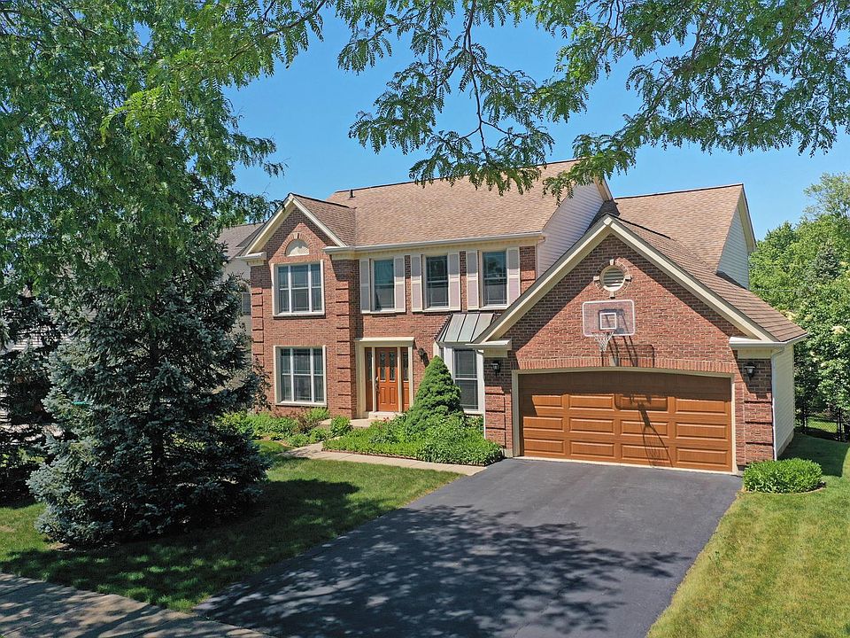 Rarely available Windsor Ridge two-story home with front brick exterior and fantastic floor plan. Two-story entry with separate living room, and dining room with bay window. Impressive family room with vaulted ceiling, skylights, stone fireplace and sliding door access to the deck and backyard. First floor office/den with a bay window. Renovated kitchen with ceramic tile floor, custom 42" cabinets, solid-surface counters, glass tile backsplash, all stainless steel appliances including a 5-burner cooktop, and a pantry closet. Eating area in kitchen with sliding door access to the deck - great for BBQ's! Oak stairs lead to the upper level with overlook to the family room. Spacious master bedroom suite with vaulted ceiling and a private bath with separate shower and tub. Three additional bedrooms all with ceiling fans and easy access to the hall bathroom. Huge english/look-out basement with daylight from a wall of windows, ready to finish, pre-plumbed for a bathroom. Energy efficient home with newer Pella windows, front door, new garage door and water heater. Fabulous curb appeal and plant collections include hoopsii blue spruces, european purple rain white birch, magnolia, tart cherry, pink and white lilac, weigela blooming shrubs, variegated dogwood, roses, bleeding hearts, deep red beebalm, lemon mint, rare varieties of irises, peonies, multiple hosta varieties, and more. Large deck in a fantastic fenced yard. Wonderful location close to parks, schools, shopping and more...hurry home!
