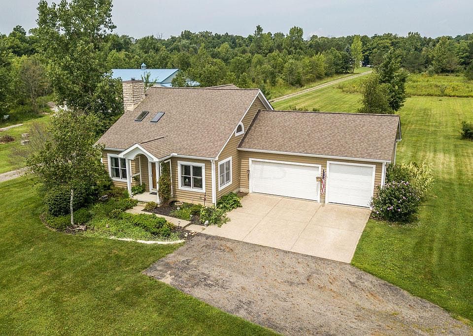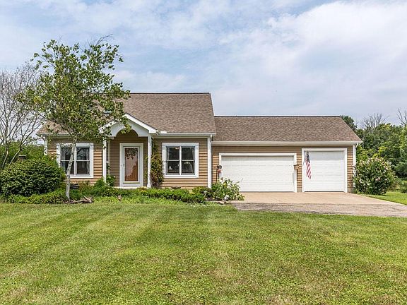 Someone w/ vision will snap this up-you will see the possibilities immediately. A peaceful, over 5 acre setting with stocked pond of blue gill & bass, mowed trails & expansive green space & mature trees. Multi-million dollars views. Soaring ceiling, sun-filled rooms including floor to ceiling gorgeous stone, wood burning fireplace in spacious great room. 1st floor master or flex room for office has 2 walk in closets, 2nd floor bedroom with ginormous walk n closet & loft easily converted to 3 bedroom.Abundance of cabinets in the eat in kitchen. Double doors lead to entertainment size cedar deck. Propane hot water tank plumbed for natural gas. Home has natural gas heat Updates include 3/4 roof replacement 2009, HVAC 2013, H2O 2013, City sewer. Needs Carpet, Dog odor exists. Make it home!