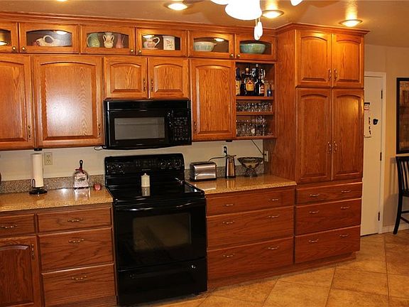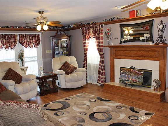 Turn key beauty with updates throughout. The kitchen is decked with Corian surface, pull out drawers, glass display cabinets, and a breakfast bar. Tile and hardwood throughout the home really tie the plan together. The oversized living room has an updated gas log fireplace and French doors that lead out to the covered patio which bolsters a pretty view of the golf course, large storm cellar, and storage building. Low E window (tilt) upgrade has been done in all rooms. The West bedrooms have cedar lined storage under the bay windows. Residential items include Hot tub and Security system that can stay with the right offer. With a new roof in 2016 and all the updates, We cannot say enough about this one. Call today for your private showing!