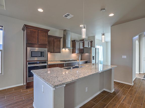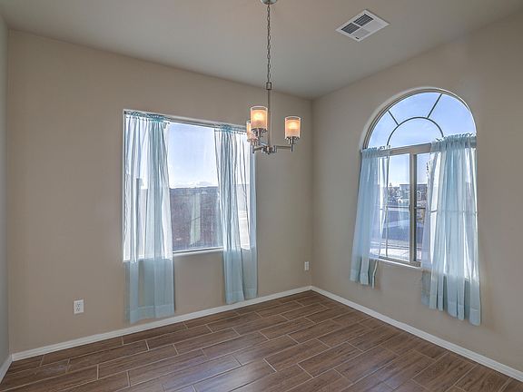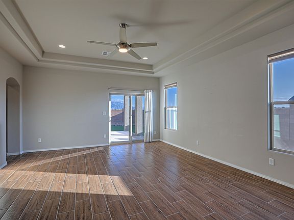 This open floor plan home is just under two years old. The kitchen has granite countertops, stainless steel appliances and the kitchen island is perfect for family get togethers. The primary bedroom is situated toward the back of the house where the views of the Sandia Mountains can be seen. Walking into the primary bathroom you are met with a double sink vanity with granite countertops and the walk in shower has a tile surround. Mountain views can be enjoyed in the backyard. The large corner lot and 3 car garage are great attributes to this wonderful property.