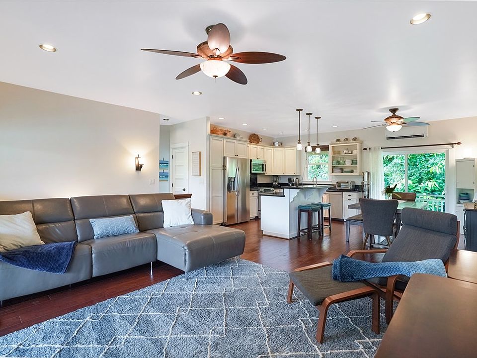 This immaculate 3 bedroom 3 bath home is designed to make life at home easy and enjoyable, providing plenty of indoor & outdoor living comforts while giving the option for added income. TOP FLOOR: 3 bedroom 2 bath Open concept living area w/ a beautifully upgraded kitchen & granite countersHardwood floorsAmazing mountain views from a large Ipe lanai to relax, nap, entertain & enjoyMaster bedroom has a beautiful en-suite bathroom w/ walk-in shower & walk-in closetSecond bedroom has custom built twin bunk beds & storage cubbiesUpgraded hallway bathFully air conditioned top floor keeps the temperature comfortable (also a dehumidifier & heater)Laundry closet on lanai for easy accessBack lanai gives quick access to back of houseOn-Demand water heaterFIRST FLOOR:Large living area w/kitchenette for your guests or extended familyTwo additional bonus roomsFull bathroom & half bathroomLifeproof flooring & Travertine floorsTwo air conditioning units keep the entire floor comfortableAdditional laundry room for easy accessSecond On-Demand water heaterOUTSIDE LIVING:Beautiful, large new lava rock Koi Pond with a variety of fish & water lilies for relaxingGas fire pit to warm you at nightAccent lighting to guide your wayPlayhouse and Pergola deck for the littles to enjoyTwo large sheds for all your toysPrivate outdoor shower to wash off after beach daysENCLOSED GARAGE:Renovated finished garage/living space with kitchenetteCan be used as a game room, music room, movie room (large projector screen built in), art studio, endless possibilities!Can be sold turn key, furniture negotiableThere are many features that make this home perfect! The complete list is appended to this MLS listin