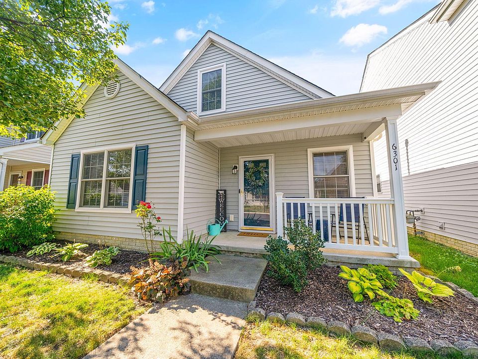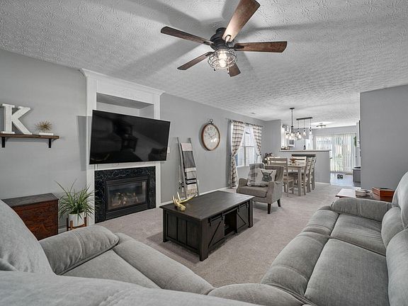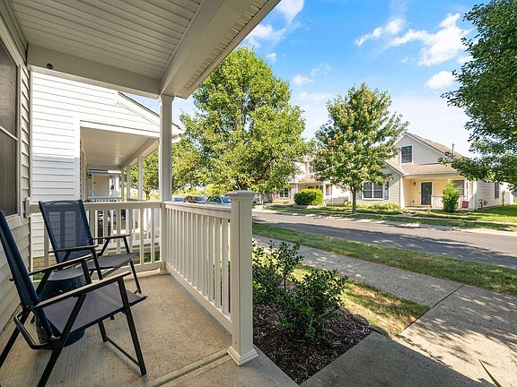 Enjoy simplified living at the quiet Village at Schirm Farms with maintenance provided (lawn care and snow removal). Upon entry, you are greeted by new carpet ('24), neutral paint ('23) and a gracious living space with gas fireplace, TV niche and ceiling fan that flows directly into dining. Eat-in kitchen features white cabinetry and appliances (dishwasher and microwave '22), ample counter and pantry space and opens to backyard patio. Private first floor primary suite with adjacent laundry (W/D to convey). Upstairs includes 2 generously sized bedrooms and updated shared bath ('24). Attached 2 car garage is oversized for additional storage. Front porch with lush landscaping enhances the curb appeal. Additional updates include new HVAC ('22). Convenient access to Hwy 33 and I-70. *See A2A