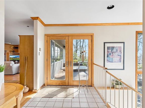 Peace and tranquillity awaits you at 6301 Woodfern Drive. A haven reminiscent of a Frank Lloyd Wright inspired home. This property privately sits on 8.48 acres on South Mountain. As you walk through front door the first thing you'll notice are the many windows filling up this home with natural sunlight and the amazing view of the landscape. Custom tile throughout, including original Mercer tile around the flooring of the living room fireplace and the backsplash of the butlers pantry. The First Floor offers a Primary Bedroom with custom built drawers and a Primary Bathroom that has heated flooring, jacuzzi tub and a standing shower. The living room comes equipped with Bose surround sound stereo that also connects to the outdoor Bose speakers on the deck. The trex deck has an amazing view with a built in hot tub. There is a media room on the first floor with a fireplace, which could also be great for a home office. A half bath and laundry room is just off of the kitchen. The lower level has a full bathroom, living area, 2nd bedroom, 2nd laundry room and plenty of storage space. Outside you will find beautiful stone landscaping and a custom waterfall designed by Plantique Landscaping. This property also offers a detached 1 bedroom guest house with a full bathroom, laundry room, kitchenette and its own garage. This privately situated home truly is a one of a kind. Minutes from shopping/ restaurants at The Promenades, Saucon Valley Country Club and Wedgewood Golf Club.