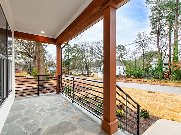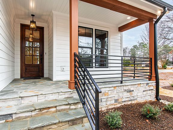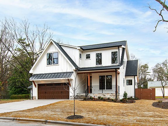 Nestled in a prime Raleigh location, this brand-new luxury farmhouse blends classic design with high-end modern touches. From the striking stone-accented façade to the covered rear porch with Trex flooring, every detail is crafted for both beauty and function. Step inside to soaring 9-foot ceilings, rich hardwood floors, and an open-concept living space anchored by a sleek gas fireplace and expansive Win-Door multi-panel sliding doors—seamlessly blending indoor and outdoor living. The chef's kitchen is a true showstopper, featuring custom cabinetry, quartz countertops, a farmhouse sink, and a gas cooktop with a designer hood. Entertain effortlessly with a built-in wine bar, French door refrigerator, and under-cabinet LED lighting. The primary suite is a private retreat with a spa-inspired bath, boasting a frameless glass shower and quartz-topped dual vanities. Smart and energy-efficient, this home includes a tankless water heater, Wi-Fi-enabled thermostats, and a sealed crawl space. With no HOA restrictions, a fully fenced backyard, and a prime location, this modern farmhouse is where elegance meets everyday ease.