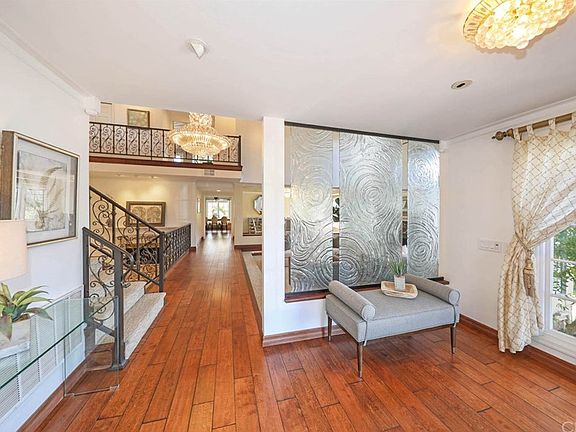 With gorgeous curb appeal and prime corner lot location next to a spacious greenbelt, this expanded SeaCliff on the Greens E Plan is an entertainer's dream! The grand entrance features a wrought iron front door with reeded glass, Palm Springs maple wood flooring, and custom decorative glass room divider. The versatile floor plan has several entertaining spaces, including impressive living room with marble fireplace and elegant chandelier, dining room overlooking sparkling pool, game room with built-in cabinetry and fireplace, and family room with large wet bar. The bright chef's kitchen features quartz counters, stainless steel backsplash, oversized stainless steel sink, LG refrigerator, Viking range, Fisher Paykel dishwasher, dual ovens and microwaves, and separate beverage refrigerator. The adjoining breakfast nook includes a window seat and built-in bar area. Upstairs, the expanded master suite has a spacious retreat area, marble fireplace, wet bar and wraparound balcony overlooking greenbelt. "His and Hers" master bathrooms with separate toilets, vanities, and closet space are conjoined by a custom etched glass shower enclosure. The private backyard includes mature fruit trees, saltwater Pebbletec pool & spa with rock wall fountain, pizza oven, BBQ, bar station with sink and refrigerator, heaters, and more. Additional upgrades include newer carpet, newer roof, stone flooring, crown molding, plantation shutters, custom light fixtures, dual ACs, and so much more! Must see!!