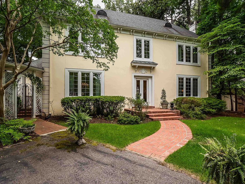 A home for connoisseurs! Sited above the street near the end of the cove, the exterior style suggests tasteful, historic charm. Custom built in 1979, quality abounds. Real stucco. Wood, brick & marble floors. Antique doors. Newer kitchen & baths (consistant style & quality). Thoughtfully sized rooms w/ proportionately sized windows. Downstairs BR now used as study. Primary suite plus 2 more BRs & shared bath upstairs. Enchanting verandah w/ porch below. Views of private gardens throughout.
