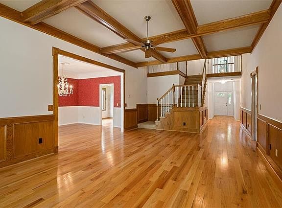 Lovely maintenance-provided 1.5 story in popular Nottingham Downs! Great room with gorgeous 10' high coffered ceiling, wainscotting, and fireplace. Kitchen features stainless appliances - fridge stays - gas range and eat-in space. Master Suite and Second Bedroom/Office on main level with Third Bedroom and Full Bath - updated in 2018 - on second floor. Formal Dining, Sun Room, 1st floor Laundry. Hardwoods. In-ground sprinkler. Blue Valley Schools. Fab location close to dining, shops, entertainment and services!