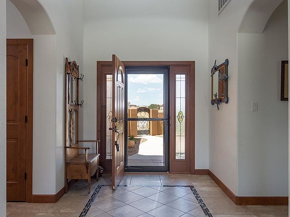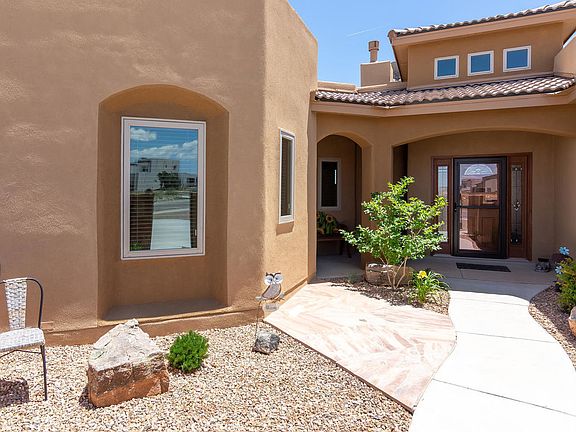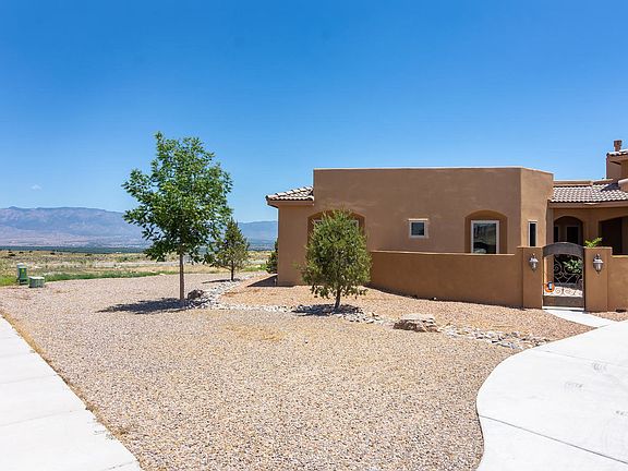 Proudly Presenting this exceptional single level custom showcasing an open & bright floor plan with numerous amenities! Situated on a .36 acre lot with backyard access, gorgeous VIEWS of the Sandia Mountains & breath-taking professional landscaping by Hilltop! Charming courtyard entry! Discover 20x20'' tile floors, raised ceilings, arched doorways, & clerestory windows! Beautiful great room with gas log custom fireplace & wall of windows framing the stunning backyard with water feature, lawn, expansive covered patio & VIEWS! DELUXE kitchen with island, abundance of custom cabinetry with under cabinet lighting, walk-in pantry, granite, tile backslash, & 5 burner cook top. Delightful master w/luxury bath room: tiled shower, double vanities, garden tub, large walk-in closet! Water softener!