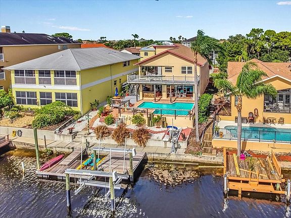 Pool Home with large covered lanai and outdoor kitchen with grill, icemaker & refrigerator. Boat lift, floating dock & standard dock. Brick pavers surround the pool, Lanai and a relaxing firepit area. 4 bedrooms, 3 baths & 2 car garage. Top floor of home has open floor plan with Living Room, Dinning & Kitchen combination. Outside of living room sliding glass door is a huge patio uncovered to enjoy the evening sky's. Also includes Master with private bath, dual sinks, shower walk in closet. 2nd bedroom & bath on top floor as well. Second floor has two bedrooms, Jack & Jill bath, kitchenette and large bonus room with sliders out to the covered pool area. 2017 A/C, Concrete Seawall reinforced, Garage Door, 2016 Upgraded Windows & Roof. Property has tons of outside storage for boating & pool toys. Community has Clubhouse, Pool, Tennis Courts, boat docking and private boat ramp. Gulf Harbors Yacht Club year round membership is $772.00 per person and seasonal $557.00 per person. Pasco Scalloping season July 2022.