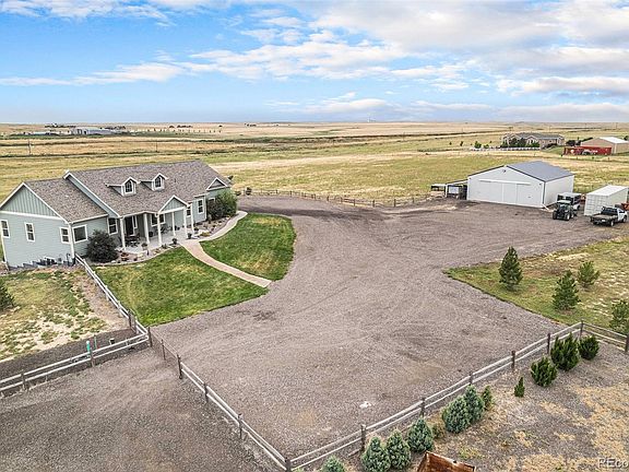 Enjoy peaceful country living on 35 beautifully maintained acres just minutes from both Byers and Strasburg and 30 minutes to Denver and DIA! Bring your animals, there’s plenty of room to roam! Whether you have horses, goats, chickens, or just dream of wide-open space, this property is ready for your lifestyle with a 1,726 square foot barn and raised garden beds. Thoughtful landscaping surrounds the home, creating a welcoming and well-kept feel as you arrive, with a covered front porch perfect for enjoying those Colorado sunrises. Inside, the open floor plan features vinyl plank flooring in the Great Room, dining room, and kitchen, plus vaulted ceilings and a cozy gas fireplace with a brick wall surround. The kitchen is the heart of the home with granite countertops, stainless steel appliances, pantry, and sunny breakfast nook. The spacious primary suite offers a private retreat with a luxurious 5-piece bath and a large walk-in closet. Two additional bedrooms, a full bath, a flexible dining room or office space, and a convenient laundry room round out the main floor. A bonus room above the garage offers space for a second living area, home office, or guest suite. The finished walk-out basement features soaring 9-foot ceilings, built-in cabinets, a refrigerator, a bedroom, and a ¾ bath—making it ideal for guests, hobbies, or entertaining. Step out to the deck or covered patio to take in the endless views. With a 3-car garage and plenty of parking for toys, trailers, and guests, this home offers the best of Colorado country living with easy access to US-36, Highway 40, and I-70. The barn has electrical and is 2/3 dirt flooring and 1/3 crushed asphalt. This House shows great and is in excellent condition. Welcome HOME!