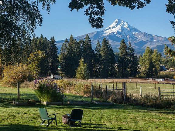 Stunning Mt Hood views from this 2 acre level property with quaint 1756SF farmhouse.3BR, 2 bath, 2 car detached garage w/ adjoining 3 stall barn,lg carport,& 3 dog runs.Cross Fence pastures.The kitchen opens to the dining rm,french doors lead to the spacious paver patio & covered deck for entertaining.Inground irrigation for pastures & yards. Riding trails nearby.Mature trees.