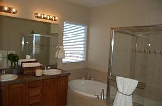 Ranch Style Former Model Home with numerous upgrades. New 2010 2 beds/3 baths. Great rm with Dble Tray ceiling, Surround sound & ceiling fan. Gourmet Kitchen with full height cabs, built in ovens, gas cooktop, refrigerator & Granite. HUGE walk in pantry. Entry & Kitchen have hardwd flrs. Master suite with separate office/nursery area (8'X 12') Luxury upgraded 5 piece master bath. Plantation shutters throughout the home. Large yard, outside fireplace and covered Patio. Better than new.