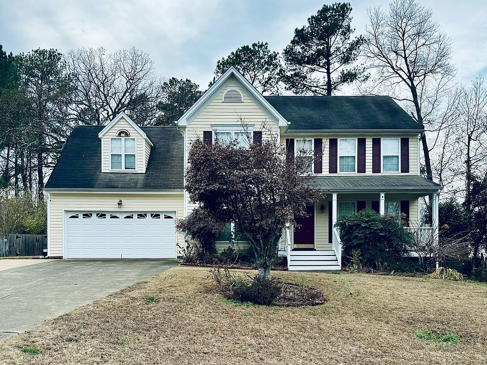 Exquisite two-story residence located in the Wake Forest area. The kitchen is filled with natural light and features a bayed breakfast area. The formal dining room boasts elegant hardwood floors, and bi-fold French doors gracefully separate the kitchen from the living room. The master bedroom is adorned with a trey ceiling, ceiling fan, walk-in closet, and a spacious master bath with an oversized shower. The fourth bedroom also serves as a versatile bonus room. Enjoy outdoor relaxation on the covered front porch, screened deck, and stamped patio