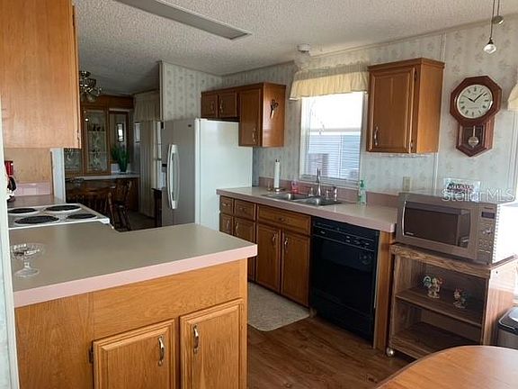 2 BR/2BA immaculate move-in-ready fully furnished 1991 Homes of Merit in 55 and over community. Over 1600 sq ft of living area. 2 Large enclosed Florida Rooms, (one looking out to the community clubhouse, heated pool and shuffleboard court with newer windows). Large living room with open floor plan. Large master bedroom. Large inside laundry. Wood cabinets in kitchen. Formal dining room with built in china cabinet. Large master bathroom with jack and Jill sinks. Newer toilets. New laminate floor in master bathroom. There is a refrigerator freezer in kitchen and extra refrigerator in Florida room. 12 X 10 workshop/storage shed with lots of shelving. One pet allowed up to 30Lb. Great location for winter home or full time residents. Located between Orlando and Tampa. Near Orlando and Tampa airports, beaches and Disney.