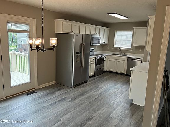 No expense was spared in this beautifully remodeled raised ranch (1958 finished sq. ft., plus a 2 car garage with 2 new openers and large storage closet). Located in the desirable Windwood Subdivision in Fern Creek right off Bardstown Road. This fully updated home is a must-see, offering high-end finishes and a thoughtful design throughout. The home has been completely renovated, featuring two brand-new bathrooms and a stunning, modern kitchen. Major updates include a new HVAC system, new Owens Corning Duration shingle roof, fresh paint, carpet, and updated lighting in every room. In addition, to new carpet in all bedrooms and the landing, luxury vinyl plank flooring has been installed throughout the main living areas................ The spacious eat-in kitchen boasts crisp white cabinetry, new solid surface countertops, and brand new stainless steel Maytag appliances. The kitchen opens to a generous deck overlooking a fenced backyard perfect for outdoor entertaining. The oversized primary suite includes a large walk-in closet and a luxurious ensuite bath with a double vanity, a full tiled shower with glass walls/door, and a soaking tub. Two additional bedrooms are located on the main level, with a fourth bedroom, cozy family room, and a spacious laundry closet on the lower level. This home is a total transformation don't miss your chance to own this turnkey property in a prime location.