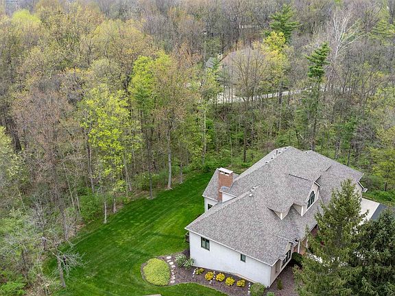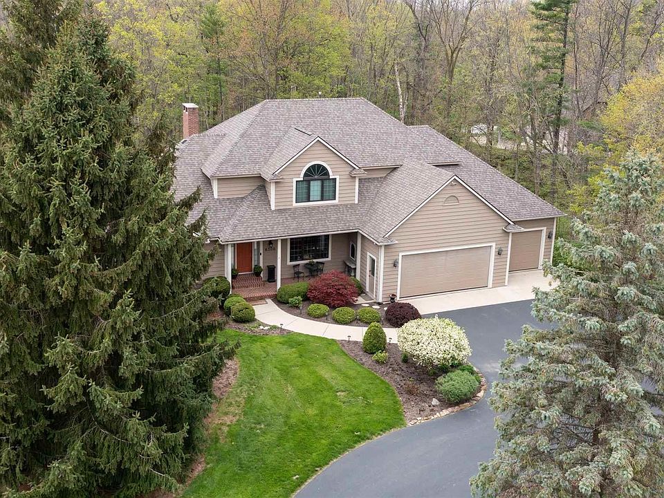 The best of both! The country feel with nearly 2 acres of land, but close to everything! This impeccable one owner home welcomes you with a generous covered front porch that sets the tone for enjoying nature. A wall of windows draws you into the GR that overlooks the ravine and woods. Main floor owner's bedroom retreat has it's own balcony, private water/shower closet, jetted soaking tub and dual vanities. Granite SS eat-in kitchen with large island opens to the screen porch for easy summer living. Upstairs you will find a den and 2 additional bedrooms~ each with a private ensuite and walk-in closet. The walk- out lower level has a large family room with another fireplace and kitchenette/bar. There is a rec space as well, and behind "Let the Games Begin" is the frame for another window to add if desired (could be a 5th bedroom). An additional room is currently used as a 4th bedroom. Full bath and AMPLE shelved storage finish out the lower level. Well with sewer means only $60 water bills every month! Recirculating pump for fast hot water. Nearly new water heaters. PLEASE REMOVE SHOES OR USE FOOT COVERS FOR SHOWINGS.