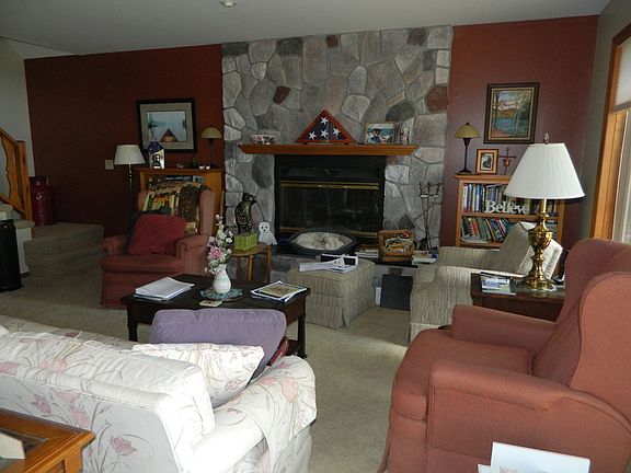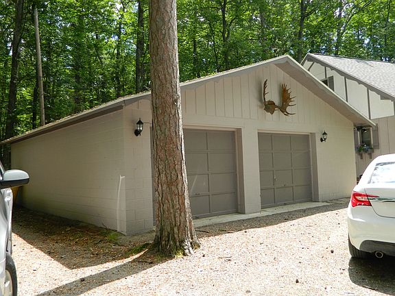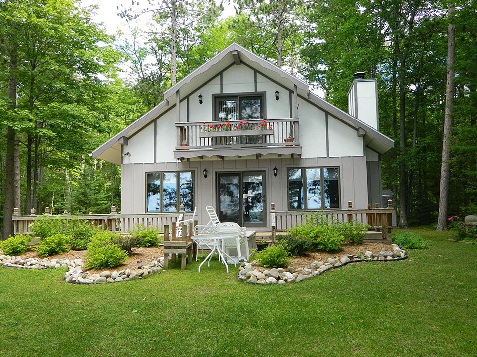 1 1/2 story wood sided chalet, cultured stone natural gas fireplace. Open living, dining and kitchen area. French doors opening to wrap around deck facing the water for front seating at sunset. 3 bedrooms, 1 3/4 baths. First floor laundry and master bedroom. Oversized block 2 car garage. Storage shed and circle drive freshly graveled. Central air and full home Generac generator and even manicured lawn. This home has all the finest qualities of lake living.