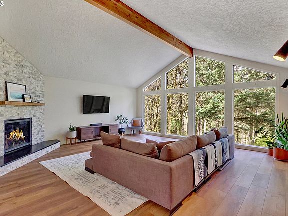 Beautiful, updated NW contemporary on private street with only three homes! Ideal location directly adjacent to George Himes Park, less than three miles to OHSU, and close proximity to downtown yet feels like you're nestled in the trees and worlds away. Open floor plan with vaulted ceilings, walls of windows, and skylights everywhere. 3 bedrooms, 3 baths, bonus room (could be 4th bedroom), plus two additional flex spaces. Two of the three bathrooms have been updated, new flooring throughout main level, open rail staircase, updated gas fireplace, newer roof, newer furnace. Home is being sold with the adjacent 10,853 square foot lot next door and currently being used as a glorious private yard. Already divided though and could be enjoyed or sold!