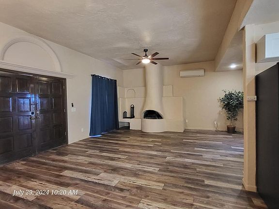 A Great Santa Fe style home featuring a large primary bedroom with separate bathroom with a tub and separate shower. Huge walk in closet. The large living room features a wood burning fireplace perfect for those chilly evenings. A modern kitchen with island and a dining area. Inside laundry. Also included is a HUGE 4 car garage on 2 acres. This home is water haul and the equipment is provided. Pets ok additional fees will apply.