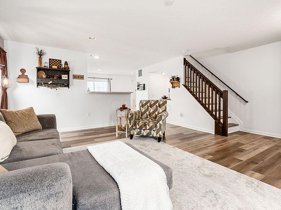 Beautifully maintained and impeccable condition on this end unit condo. Recently updated wide plank wood laminate flooring on 1st and 2nd floor. Open living room with plenty of natural light and seating areas. Kitchen is spacious, eat-in area, newer appliances, and it could easily accommodate a center island. Upstairs you'll have a huge primary suite w/vaulted ceilings, lots of natural light, generous closet, and an attached bathroom suite. 2nd bedroom w/full bath is great in size, and bright. The basement is finished with a fireplace, half bath, and ready for entertaining or just hanging out with a movie. Off the kitchen is the patio, fenced yard, and access to your 2 car garage. Pool, clubhouse, and rec center available too. Seller will pay $1500 towards buyer's CC. This has it all!