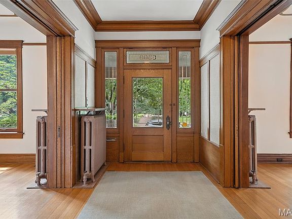 - Description: Spacious Entry hall with hardwood floors, custom millwork, fabulous staircase, one of a kind painted art glass window on landing between 1st and 2nd floor