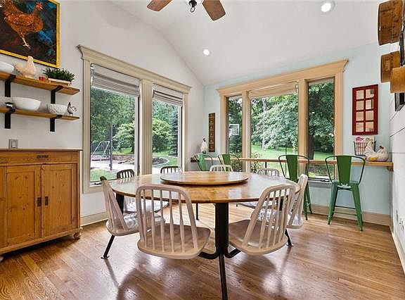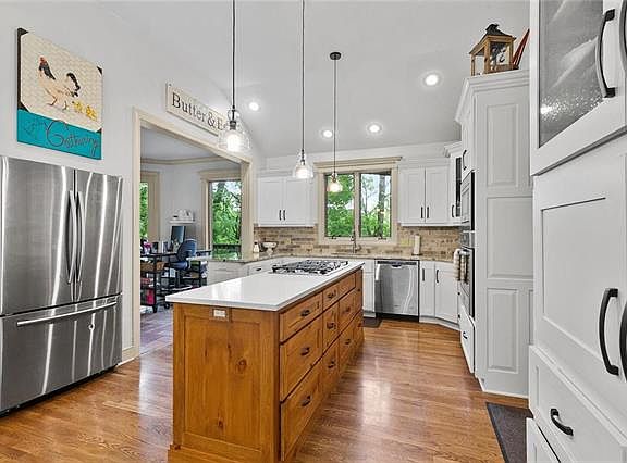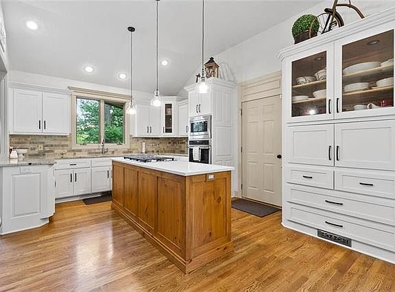 Stunning Updated Farmhouse in Private Park-Like setting. Kitchen features Custom Cabinets, Gas Cooktop, Built-In Ovens, Granite, Vaulted Ceilings & Wood Floors. Great Room has 2-Story Ceiling, Fireplace & Chandelier that once hung in a KC Hotel. Beautiful Serene main level Master Suite. Basement features Stained Concrete Floors, New Kitchen w/Granite, SS, Fireplace & Large Bedroom w/ huge Walk-in Closet. Basement could easily function as a Private Apartment w/ sep entrance. 30X50 Outbuilding w/ Elec, Heat & Water.