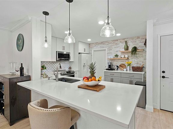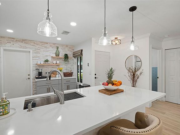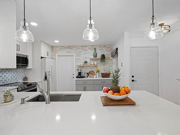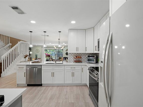 Stunningly remodeled, turnkey 3 bed 2 1/2 bath townhome in gated community of Turtle Cay. The gorgeous kitchen was remodeled in 2022. It features a beautiful, stacked stone wall, tiled backsplash, quartz counters, large pantry and coffee bar w/ underneath storage. Kitchen overlooks formal dining area and living room. Impact windows and doors with the exception of the rear slider. 1/2 bathroom downstairs is completely remodeled. Guest bathroom upstairs is beautifully updated. Large primary bedroom features a walk-in closet. Stunning primary bathroom has been remodeled and boasts double vanity and step-in shower. Rear screened in porch. Low HOA includes a clubhouse with rec room, fitness center, pool, tot lot and tennis court. Outstanding location close to stores, restaurants and highways.