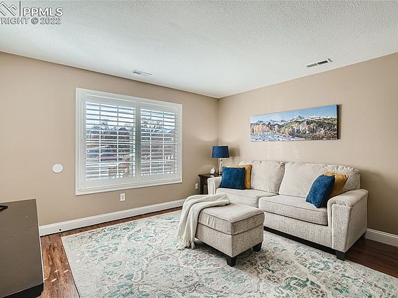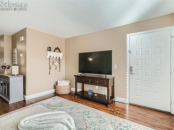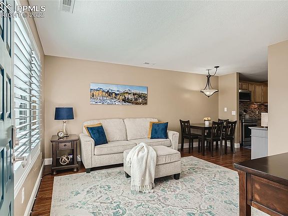 Look! Beautiful and meticulously maintained condominium delivers everything for an exceptional living experience. Great location and priced to sell. This main-level condo is clean, has gorgeous wide plank floors, offers outstanding features and is live-in/move-in ready now. Features a dream kitchen with top-of-the-line “like new” appliances, beautiful color scheme, nice countertops and custom backsplash. Like new, barely used, Samsung stainless steel appliance suite features: range oven that includes air fryer, roasting function, bread proofing function and more; microwave features convection oven, roasting and grill options; and clean side-by-side refrigerator with icemaker. The spacious living room and eat-in dining area boasts of natural light from the beautiful picture window accented by stylish white interior shutters. The bedroom is spacious with lots of closet space, clean neutral carpet, cordless blackout honeycomb blinds (beauty & insulation) and a private patio space. The full bathroom is fresh, clean and accented with oil rubbed bronze towel bar/ring, sink and tub/shower fixtures, oversized shower head, grab bars and a contemporary mirror. Note the white ceramic wall tiles in the updated bathroom are framed with black accent tiles and recessed shower shelf adding to the high-quality touches of this condo. Throughout you’ll notice additional added value features: air conditioning wall unit, water heater, furnace ('20), rubbed bronze hardware on doors, beautiful light fixtures, new electronic keypad door lock, storm door, lots of custom kitchen cabinetry (see space for those larger baking sheets), under cabinet lights with 3 settings, stainless steel sink with pull down single handle sprayer faucet, washer and dryer area with cabinets, and personal storage closet off the patio. The central location provides easy access to grocery shopping, coffee shops, trails, parks, I-25 and a myriad of day-to-day services. Take a look!