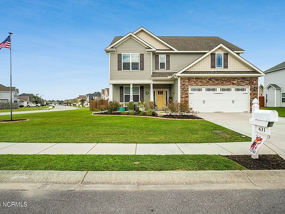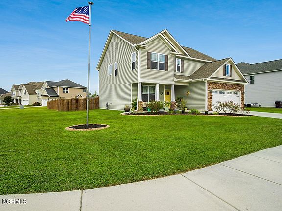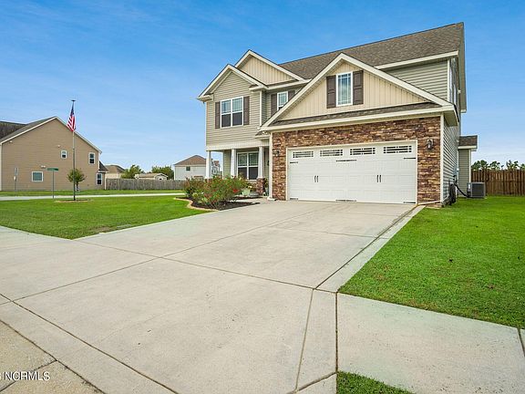 Upstairs you will find four large bedrooms, three of which share a full bath. In the Primary bedroom you will find a true retreat space with room for plenty of bedroom furniture and a seating area. The private bath has a soaking tub, separate shower, and a large walk-in closet. The fenced in backyard features a patio and a shed for storage. Carolina Plantations has a large neighborhood playground and desirable schools. The home is centrally located near restaurants and shopping and Camp Lejeune.