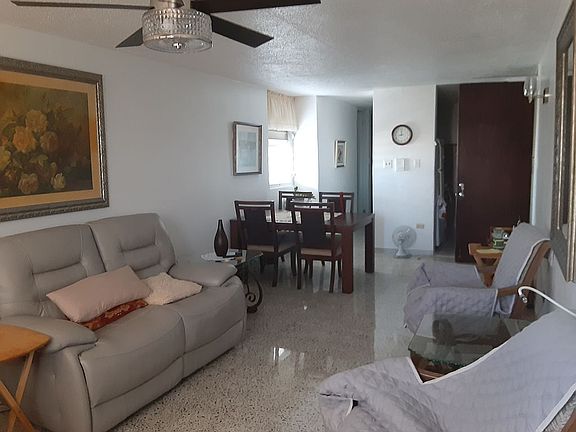 Cozy corner apartment, 2 bedrooms, 1 bath,1 parking. Gated Condo with security guard. Furnished, equipped kitchen, shiny polished floor, a/c and ceiling fan. Beautiful panoramic views from 12 floor from every room. Power generator and water tank for the building. Laundry room on each floor. Basketball court, BBQ gazebos, convention salon and children playground. No Airbnb. Annual building insurance $216. No FHA loan. Appraisal value $95,000 as of January 2022. Comodo Apt de esquina de 2 cuartos 1 baño, 1 parking, parking adicionales disponibles. Amueblado, nevera, estufa, microhonda, aire acondicionado, puertas en aluminio, televisor, calentador de linea, abanico de techo, cortina de lona exterior y cortina nueva en la sala. Piso pulido. Hermosa vista panoramica desde piso 12. Control de acceso con guardia. Facilidades de Laundry en cada piso. Areas recreativas, cancha de baloncesto, bohios BBQ, gazebo, salon para actividades. Planta, cisterna. Mantenimiento mensual $159. Seguro anual $216. No prestamo. Tasacion: $95,000 efectuada en enero 2022.
