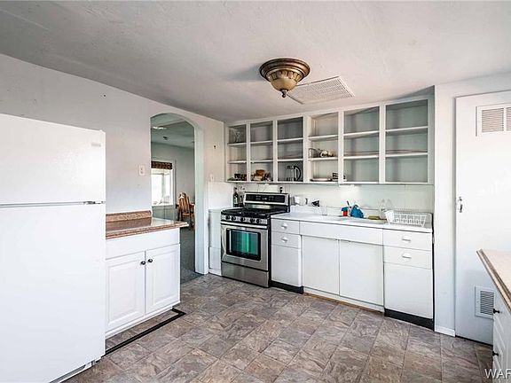 Vintage 3 bedroom 2 bath home in downtown Kingman! This home is located on a large lot at the end of a quiet cul-de-sac and offers just under 1,300 sq ft of living space with an enclosed patio, separate office/den, 5 burner stove with convection oven in the kitchen with indoor laundry/ pantry, Master bedroom has a single vanity and walk-in shower and a detached garage with plenty of room for RV parking!