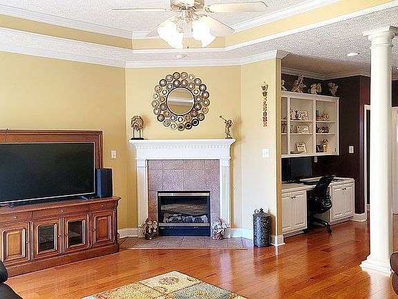 You will find updated, low maintenance landscaping as you approach the large front porch that cheerfully welcomes you. Once inside, you will find beautiful hardwood floors throughout. There is a large Great Room that features a tray ceiling and an open floor plan that leads into the Dining area with much natural light. The Great Room features an electric fireplace as the focal point. There are built in bookshelves, cabinetry and a desk.