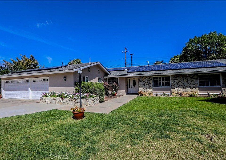 Welcome home to 631 Elinor Dr. in Fullerton!! Corner lot 4 bedroom, 2.5 bath, pool home with very private backyard, 3 car garage, living room, family room and enclosed patio! Kitchen has been remodeled with laminate flooring, updated cabinets and countertops, Wedgewood stove and a walk-in, butler's pantry. Butler's pantry offers loads of storage and connection to laundry room and 3 car attached garage. Kitchen and family room are an open concept, and family room features a cozy fireplace with hearth seating. Formal living room is light and bright, is very large and offers views of private backyard through the french doors. Enclosed patio under roofline connects at family and living room corners. Continue to use as an enclosed patio, a sunroom or remove the sliding doors and permanently enlarge your indoor entertaining space! Individual laundry room off of butler's pantry features half bath. 3 car garage has own a/c and heat unit. Garage has epoxy flooring in the 2 car section, and a soundproof studio/home office in the 1 car section. Bedroom one has views of backyard. Primary suite has views of backyard, an en suite bath with double vanities, and offers access to above ground spa just steps from primary sliding glass door. Bedrooms 3 and 4 have neighborhood views. This corner lot features a large front and very large private backyard. Backyard offers quiet privacy with mature trees and plantings, and has a generous grassy area, a tree swing, an above ground spa, and saltwater pool with solar panels, newer pool resurfacing and newer pool equipment. Solar panels are paid for; Enjoy the coming summer in style while saving on energy costs! Gas BBQ and storage shed round out a generous concrete area for entertaining on side of pool. This home has all the features your growing family needs, and is walking distance to award winning Hermosa Elementary, the Puente Bike Path and local shopping, golf courses and churches. One of Fullerton's finest neighborhoods, Las Palmas Hermosa, welcomes you home to 631 Elinor Dr.!