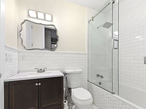 Garden duplex in mint condition with private outdoor space. Enter on the upper level to an open, eat-in kitchen and living area framed by two oversized front windows on Halsey Street. The kitchen features white wood cabinetry, grey-and-white marble countertops with matching backsplash, and stainless-steel appliancesincluding a dishwasher. This level also offers two rear bedrooms overlooking the garden and 1.5 baths; the full bath has dual access from the hallway and the primary bedroom.