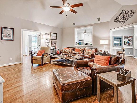 Gorgeous custom built home on 2.65 acres in Pinecroft! Spacious home with tons of updates, 10' & vaulted ceilings, new paint & lighting, renovated baths, hardwoods in great room, den, kitchen, dining room, foyer & owner's suite. Great room has vaulted ceiling, fireplace w/gas logs & built-in shelving. Beautiful renovated kitchen in 2018 has quartz counters, island with granite top, farmhouse sink, stainless double oven, double dishwasher, gas cook-top, eat-at bar & breakfast area. Owner's suite w/tray ceiling, walk-in closet, double vanity, jetted tub & ceramic shower. Three additional nice sized bedrooms on main level. Awesome finished basement has theater room (speakers, seats, screen projector all remain), wet bar with granite counters, rec room with built-in desk, bedroom & full bath. Unfinished basement w/single garage door & tons of storage. Welcoming front porch, fenced back yard, nice deck, attached garage & paved drive. 2.65 acres w/creek! Fantastic home!