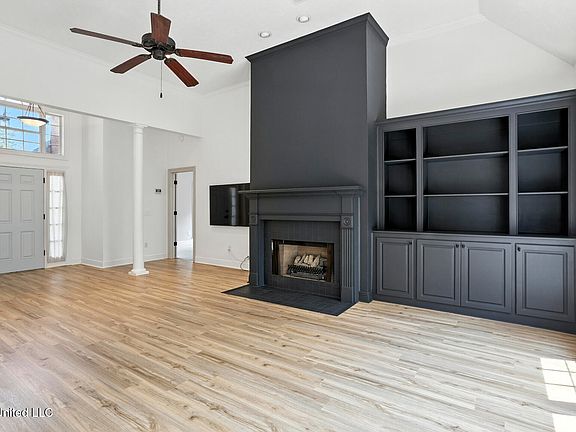 Upon entry, you'll see soaring ceilings in the open living space with a gas fireplace and beautiful, luxury vinyl plank flooring in a light, neutral tone which hides dirt very well. The mantel, fireplace, and built-ins have been painted black and they are stunning.