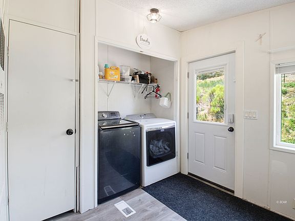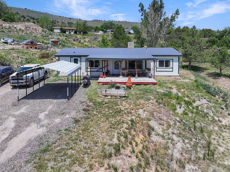This 3 bedroom 2 bath home is in a great location. This home has a split bedroom floor plan, nice sized kitchen with propane cooktop and laminate wood floors in the dining room. Well maintained pellet stove in the living room. The home has covered decks in the front and back yard. The front deck has a beautiful view of the Ruby Mountains. Sliding glass door leads out to a large fenced backyard. The home has a carport and storage shed. Roof was replaced in 2022. Windows were replaced in 2023. The shed, carport and the two story chicken coop (not on wheels) all to stay with the home.