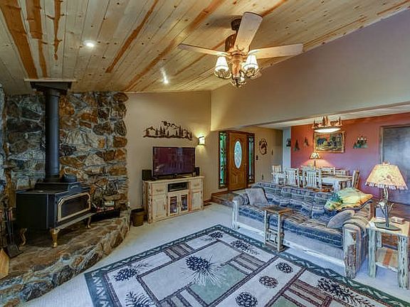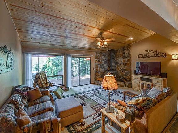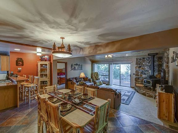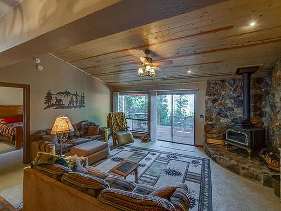 Here is a superb lake view home on a very quiet street! This well appointed cabin features vaulted wood ceilings, an exhibition kitchen with slab granite counter tops, slate tiled floors in the kitchen and dining area, a hearty wood stove with rock hearth surround, and new high quality carpet. The large deck off the main level offers very nice lake views amongst the towering trees below. The main floor master bedroom has wonderful views, and leads right out to the deck for morning coffee. If you have the toys, this is the spot for you, with a 3 car detached garage plus a bonus storage area. You can entertain the whole crew here, as the main living space features 3 bedrooms and 2.5 baths, and then the lower two sleeping areas & bathroom are accessed just down the side of the deck. With air conditioning, level access, extremely good privacy, and very nice lake views, this home should be at the top of your list!