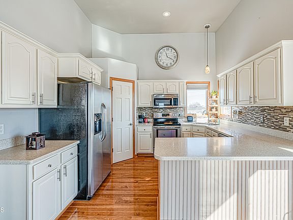 South-facing rural home located on 1.5 acres with many recent updates. A portion of the backyard is fully-fenced (yard extends beyond fence). Exterior features also include a large deck with a great view, patio area, landscaped yard with flower/garden beds, & a shed. The main floor has high vaulted ceilings, wood floors, living room with large south-facing windows, dining space with access to the spacious deck. The updated kitchen has newer stainless-steel appliances, Quartz countertops, white-oak cabinets, tile backsplash, pantry, & counter seating. The upper level hosts the primary bedroom which has dual closets & an updated ¾ private bathroom with a newer vanity including a stone countertop and under-mount sink. Completing this level is the second bedroom & an updated full bathroom with newer vanity which has great counter space. The lower level features a walk-out family room wired for surround-sound, 2 bedrooms, a full bathroom, storage room, & laundry room. This home has a 3-stall heated garage, and the driveway is fully paved. Great opportunity to own this well-cared for home.