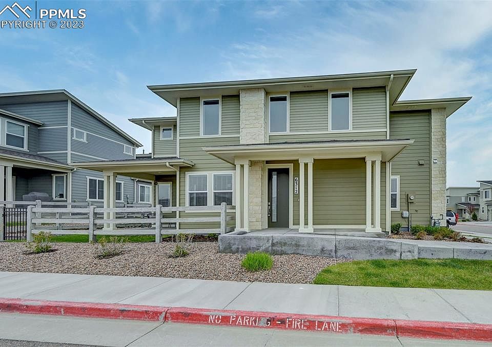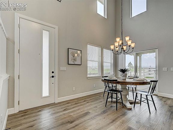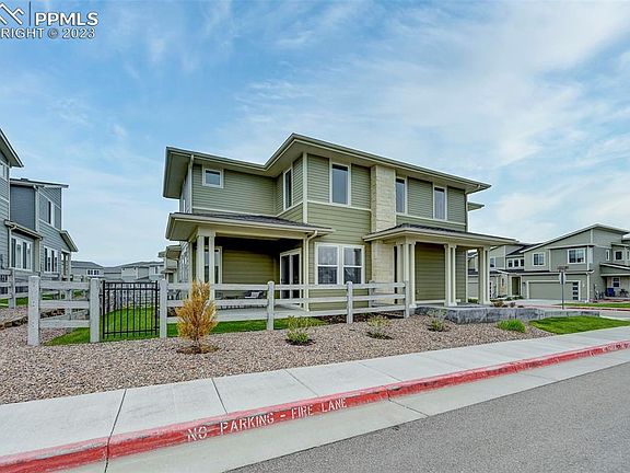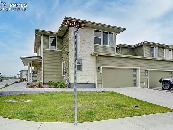 Your search for maintenance-free luxury living is over! HOA dues cover all exterior landscaping/watering, exterior maintenance/insurance, trash removal, and snow removal to your doorstep - even your driveway! This townhouse sits on the most coveted lot in the community. Unobstructed views of Pikes Peak throughout the home and you don't have to worry about future new construction in your way. Ample visitor parking and even a perfectly placed street light out front. Upgrades literally greet you as you arrive: Holiday light pre-wire on the patio/front porch, pre-wired for 2 ring cameras, even the 2 car-attached two-car garage is finished and painted with custom wall-to-wall shelving, built-in cabinets, and a dedicated circuit for a fridge! Walking into the home, you'll feel the warm embrace of luxury. Custom chandeliers in the entryway and dining room, custom pendant lights over the quartz island, and a gorgeous gourmet kitchen. A gas range w/a double oven, 42" upper cabinets w/under-cabinet lighting, and soft-close drawers and doors. This home has custom door hardware throughout, bullnose drywall corners, custom mirrors, plumbing fixtures, main-level laundry, and custom light fixtures in each bathroom. The main-level primary bedroom suite has a barn door, a gorgeous bath with a 3/8" frameless glass shower, double vanities, and a large walk-in closet. The upper level boasts 2 more bedrooms, a full bath, and a spacious loft. You'll also find an incredible high-efficiency tankless water heater! The covered back porch has a fenced-in backyard allowing little people and pets ample space to play. The home is also an easy walk to a wonderful reservoir - perfect for fishing, paddle boarding, and kayaking! Ethernet wiring for computer at Bedroom 3 and Dining Room (3) Prewire for HDMI/Outlet on wall w-Mounting brackets at Living Room / Primary BR / Loft ceiling fan prewire at Loft / Bedrooms 2 & 3 / Primary Bedroom / Living room MDF window sills and trim
